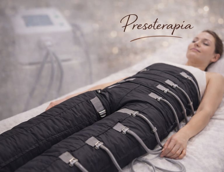 Presoterapia es un tratamiento corporal que utiliza un sistema de compresión de aire controlada para estimular el sistema linfático y mejorar la circulación. A través de un traje especial que se infla de forma secuencial, se realiza un suave masaje que ayuda a eliminar líquidos, toxinas y mejorar la sensación de piernas cansadas.